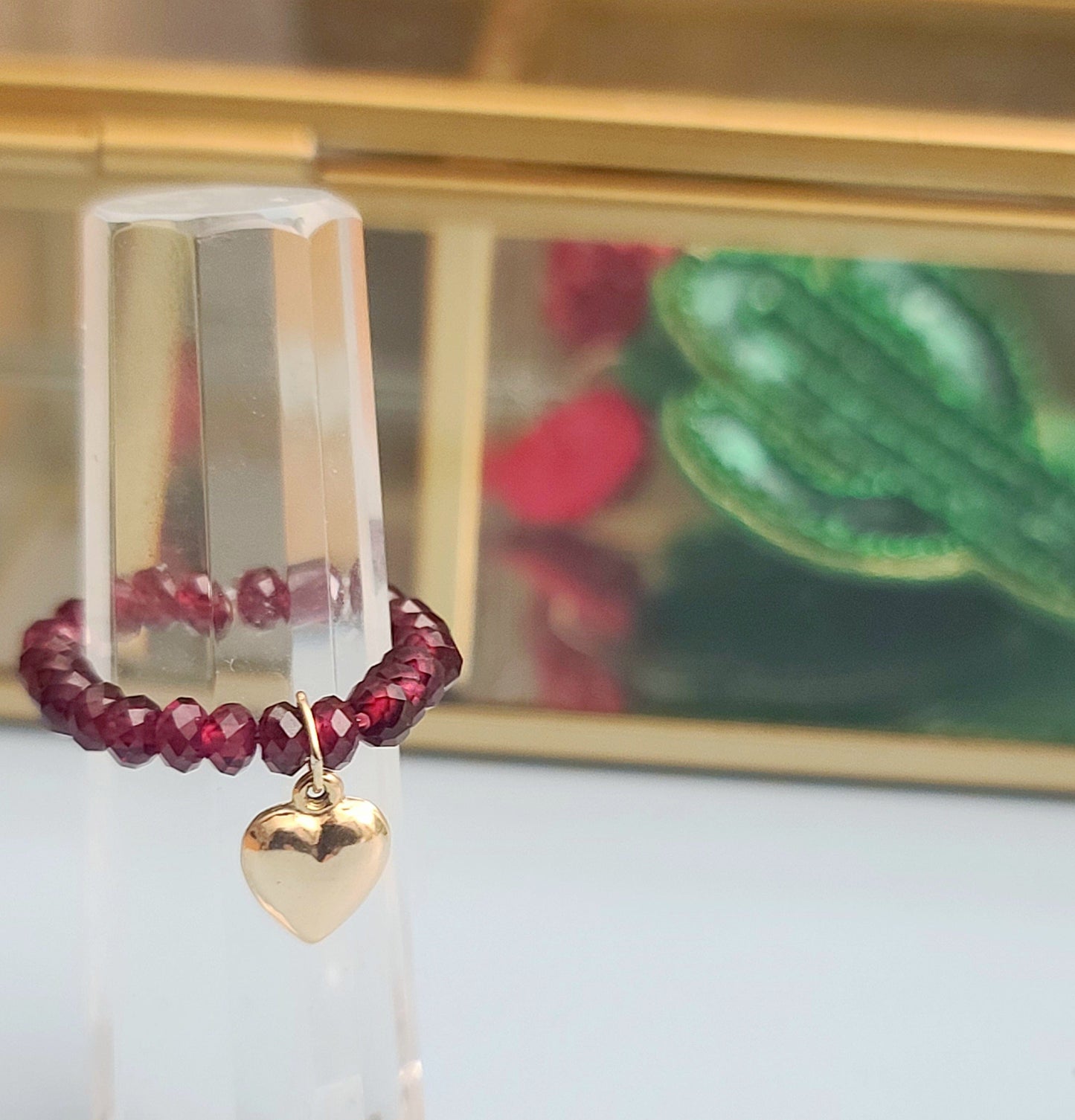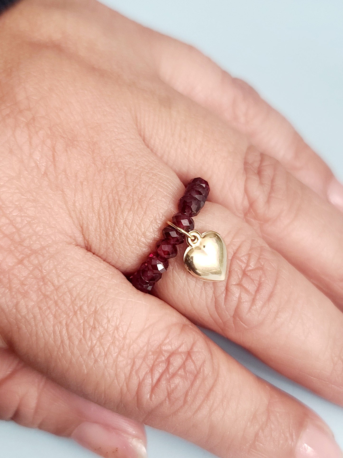 I Heart You Garnet Ring is hand strung onto a strong stretch cord. Designed with Faceted Garnet gemstones!