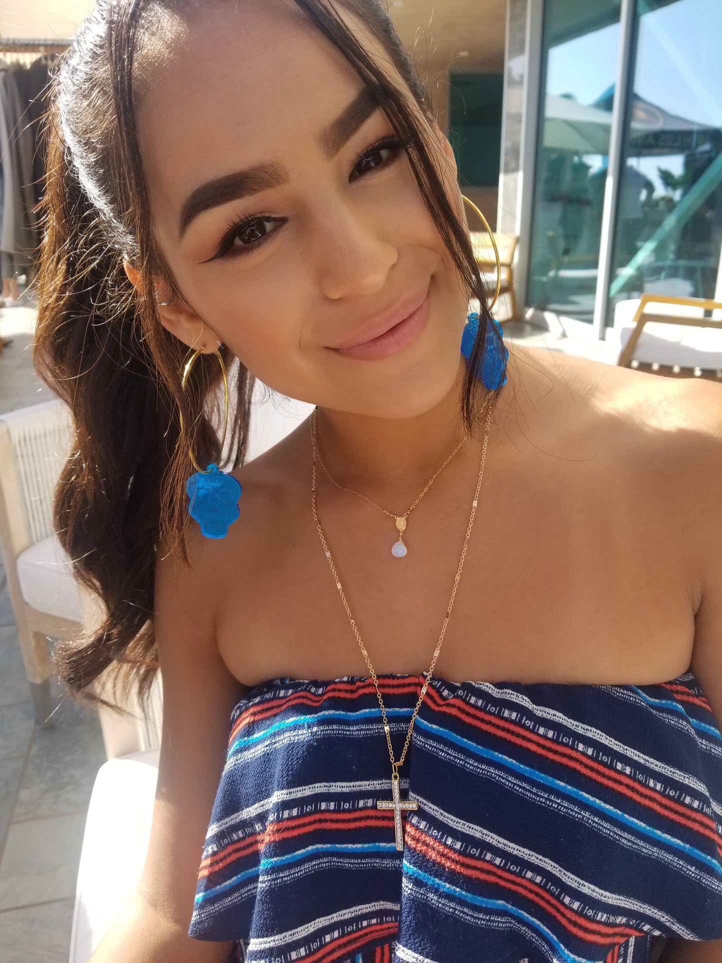 Our Sugar Skulls Hoop Earrings feel like a Dream! Lightweight in Metallic Blue Acrylic Skulls.